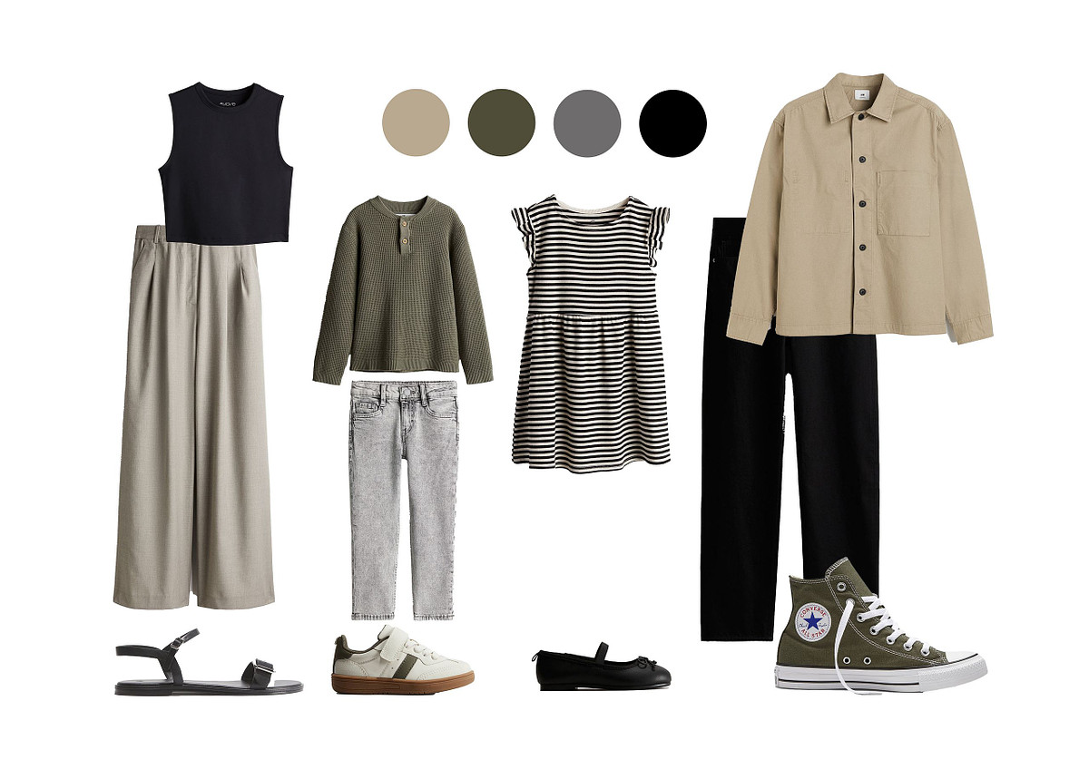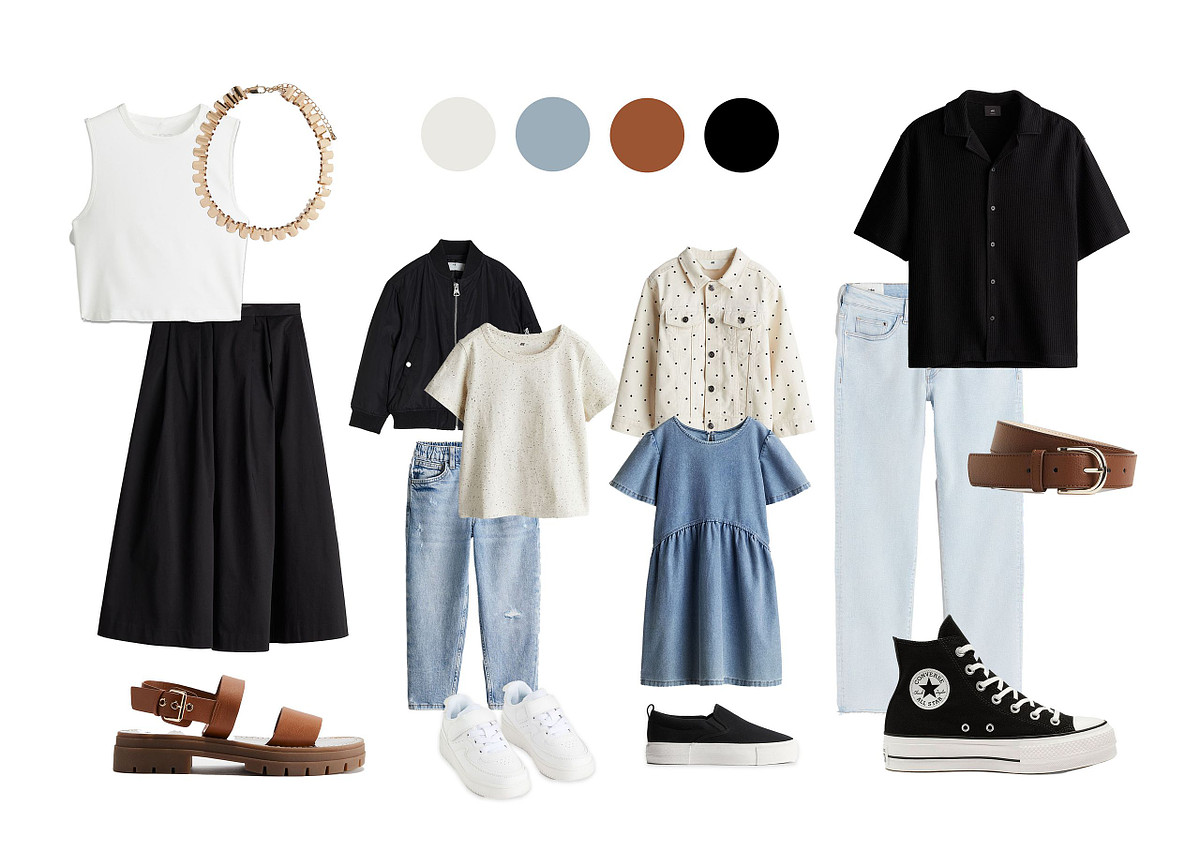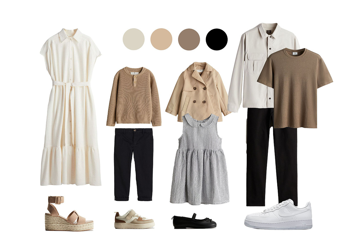 Pokud se budete fotit v páru, jako rodina nebo zkrátka ve skupině, koordinujte oblečení, aby barevně a stylově ladilo, ale nesnažte se přitom vypadat jako klony. Koordinace vytváří harmonii, ale zároveň zachovává individualitu každého člena. Stejné oblečení na všech členech bude vypadat přehnaně strojeně. Místo toho zkuste zvolit outfity v převážně neutrálních barvách, které můžete doplnit jednou nebo dvěma společnými barvami. Ty se mohou objevit na různých prvcích oblečení u každého z vás.